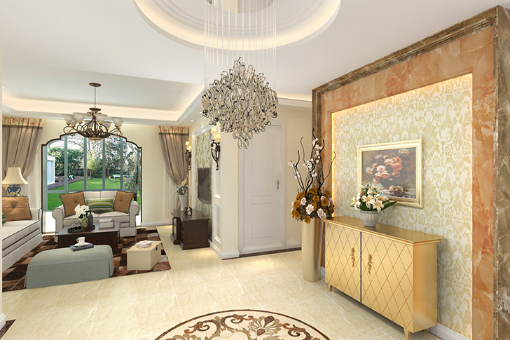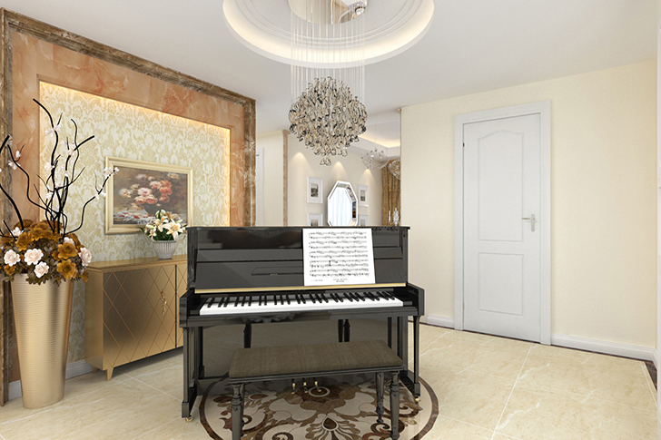 设计亮点:门厅考虑进门第一入眼的空间感和气势,并未做太多复杂工艺、工序。大大的圆形垂灯,搭配简约钢琴,一种休闲舒适感油然而生。客户要简洁,要欧式,要实用。我用线条表简洁,用花形示欧式,用格局使得空间更实用!