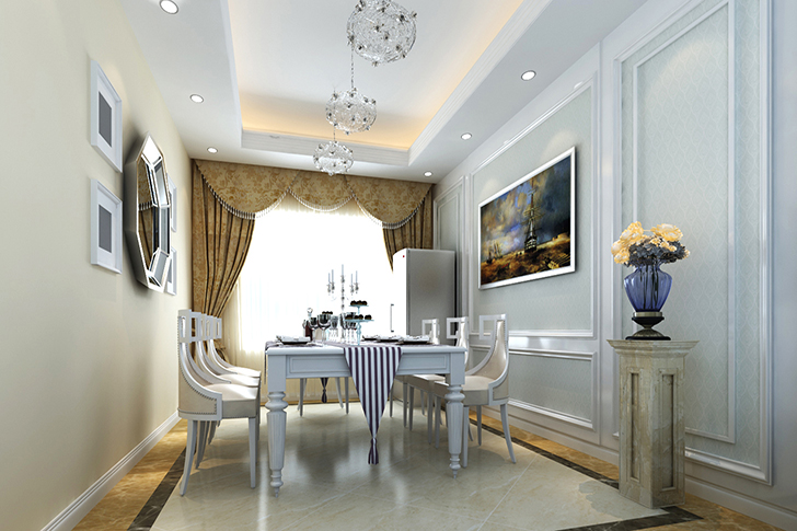 餐厅墙面部分使用壁纸和单面大面积的色漆点缀,衬托出业主的高贵、大气,展现出主人的高端品位和对生活的个人认知。欧式纹理的家具搭配以简约的墙面顶面装饰。地面简洁的波打线,与地砖的深浅搭配,更相得益彰。
