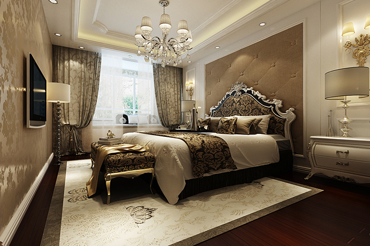 卧室地面用的是地板,墙面用软包、壁纸、背景墙处理,使业主更加舒适。房间采用反射式灯光照明和局部灯光照明,置身其中,舒适、温馨的感觉袭人,让那为尘嚣所困的心灵找到了归宿。卧室的搭配以金黄色入手,让休闲的午后有了贵族般的圆满邂逅!