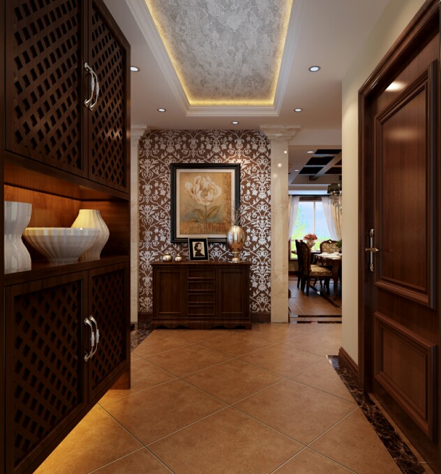 本案设计主要风格定位美式田园,简洁的造型也可以塑造高雅的品味,造型、结构简练大方,整体搭配和谐书房,厚重的木色与其它色彩搭配有很大的相容性。客厅的地面拼花,呼应墙面米色乳胶漆和大理石电视背景的同时更令空间分割更加明显。
