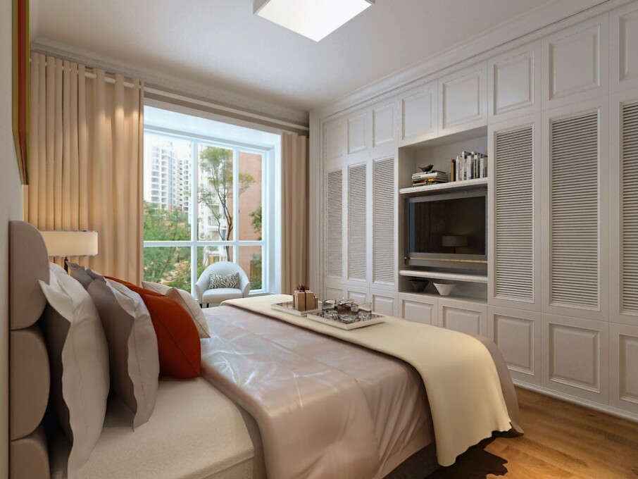 主卧室设计重点是一体柜,衣柜与电视柜相结合,不仅空间利用率高而且美观,使得面积不大的卧室释放了更多墙面空间.次卧室要兼具书房和客房的功能,设计使用了榻榻米,这样可以物尽其用不仅边角尺寸全部利用而且也扩大了储物空间,用榻榻米材料做了一体书桌书柜,即也是休闲式书房.