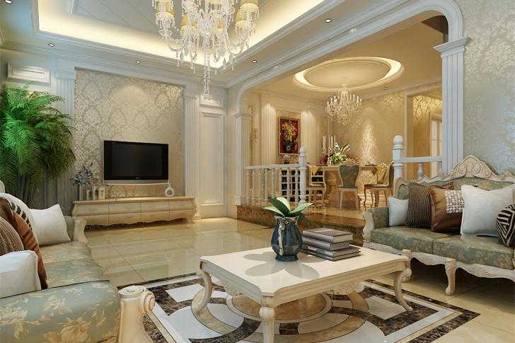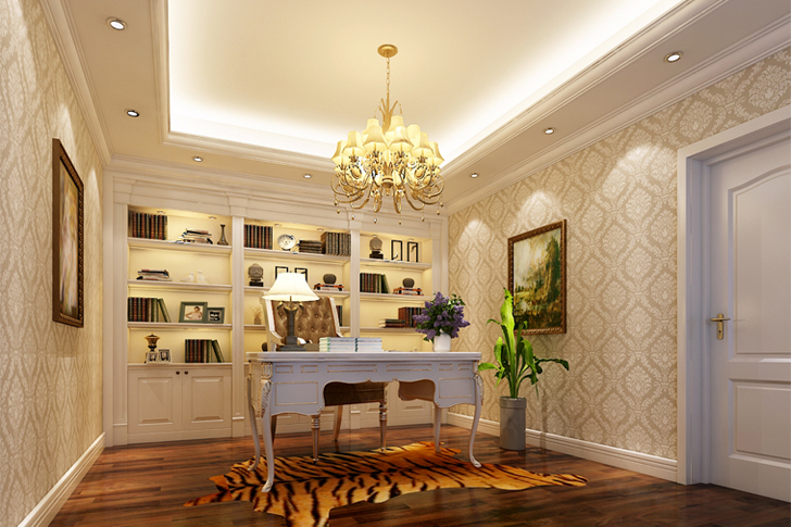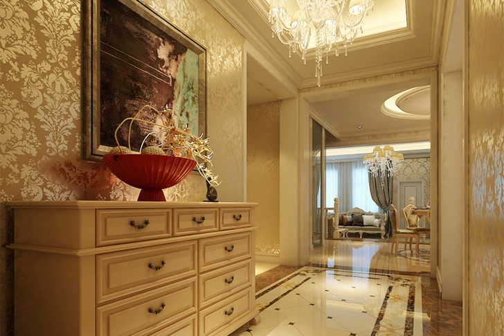 本方案为欧式风格,在软装方面,色系选择暖色系,地下墙面为浅黄褐色漆,客厅等公共区域为淡黄色花纹壁纸。沙发背景墙石膏花线与罗马柱作为点缀,突出背景墙的层次感。卧室则是选择深一点颜色壁纸更为合适。