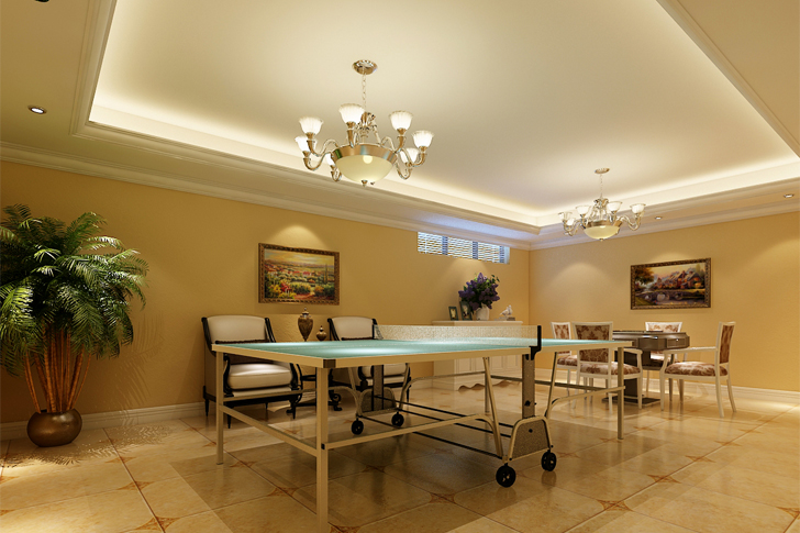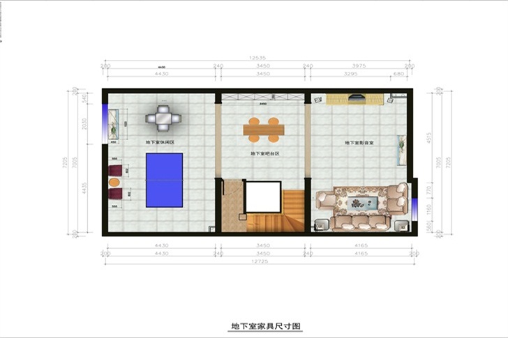 地下室楼梯过于裸露,楼梯两侧新建24公分砖墙,包两个相同垭口,把休闲区,吧台区,影音室等功能区分开。地下室全部为灯池吊顶,使空间具有层次感,也弥补光源不足。