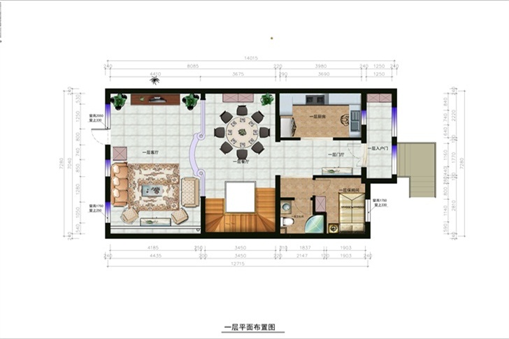 一层厨房门厅轻体墙拆掉,厨房做开敞式,也使门厅面积变大。将一层卫生间移到一层卧室左侧,扩大了客厅面积,也使功能划分更合理,客厅与餐厅垭口是罗马柱装饰,吊顶为灯池吊顶,中间以石膏板凹槽称脱,整个空间更具有立体感。