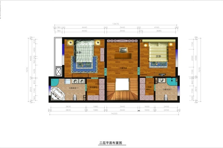 二层原始功能区划分混乱,过道,主卧与次卧间拆掉轻体墙,隔离出一间书房,防止卧室过大,空间浪费。封闭卫生间门洞,从衣帽间进入卫生间更为合理,使卧室更加美观,次卧卫生间改动与主卧相同,卧室为私人空间,所以以简单石膏线做装饰即可。