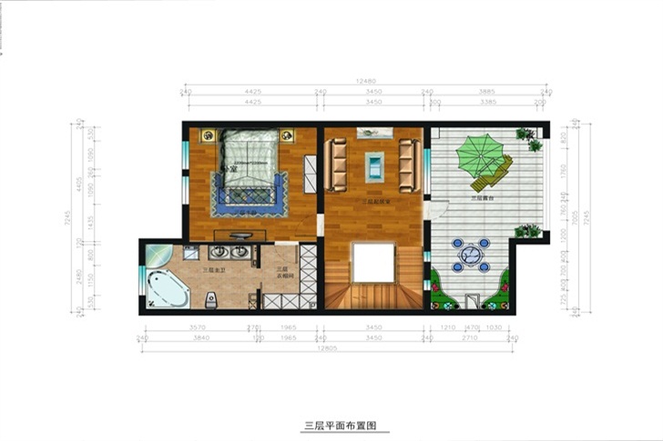 三层卧室卫生间与二层改动相同,主要是露台,布置一些花草,更为舒适。