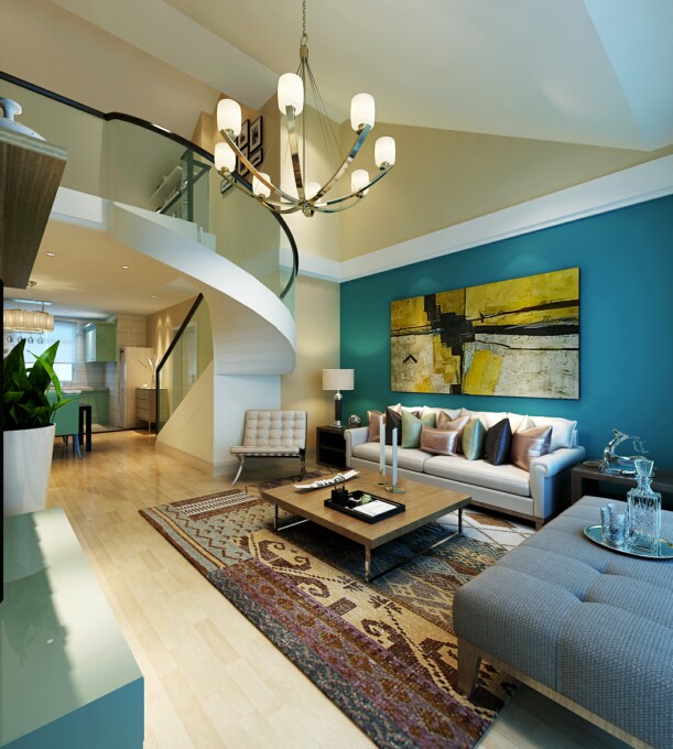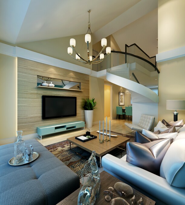 一层客厅宽敞气派, 线条简约流畅,色彩对比强烈有韵律有节奏。电视背景墙和沙发背景墙的造型,相互对应,使房间生动、整体。干净素雅的装饰给人带来前卫、不受拘束的感觉。让人不禁惊艳整座房间不同寻常的卓越睿智。