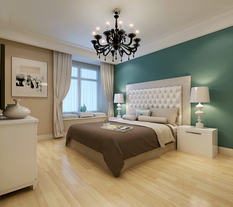 主卧整体风格的设计,是一种温馨简单的表达方式。简单的窗帘和床头背景墙在白色床头的呼应下显得一点不单调.墙壁是淡淡兰青色加上暖暖的淡黄色显得很和谐。不过在细节上,我们还是追求统一风格的。简单时尚的挂画是现代简约派的代表产品。 空间简约,但色彩的搭配弥补了视觉上的单调。整个空间的设计不单是对简约风格的遵循,也是个性的展示。