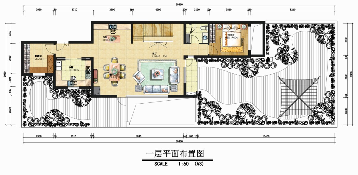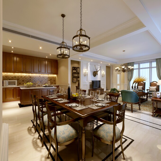 客餐厅地面使用了大地砖,整个宽敞的空间因由波打线区域划分更明朗,配有稳重不失贵气的餐桌、个性复古的吊灯,从这个角度望去,和西厨空间低奢整洁的氛围相呼应。
