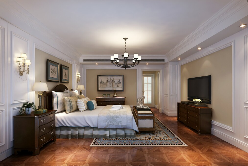 卧室配有的美式特色家具,与咖色地板和谐搭配,复古的地毯让整个空间更有品味,背景墙则用壁纸搭配白洁的石膏线做饰面,居室更加随意、简洁怀旧、实用舒适。
