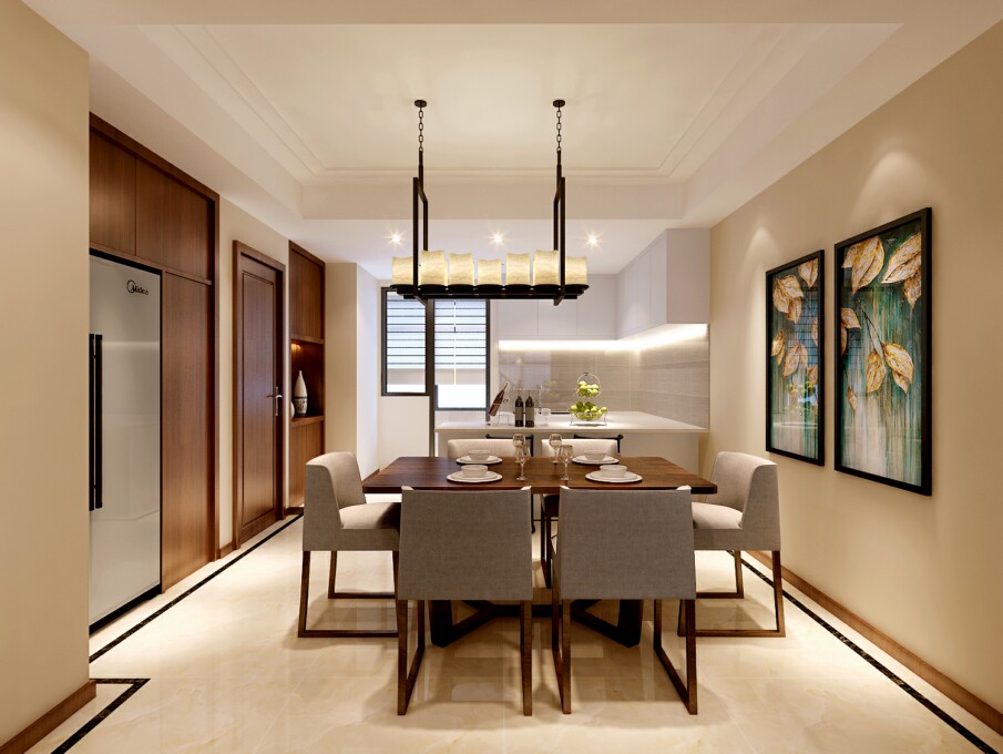 中西厨的分离实用又美观,使房子的空间更加通透。原户型西厨区域是中厨,于是我们把墙体做了改动,把方案优化到了最佳程度。西厨做了一个岛台,可供吃早点,喝红酒,细细的品味生活。也可以一家人围在一起包饺子,享受着那份来之不易的幸福。冰箱和柜子融为一体,墙上的挂画简洁中带着神秘。既然餐厅是为了让家人围聚在一起,那么周末的生活谁还想他乡为客。