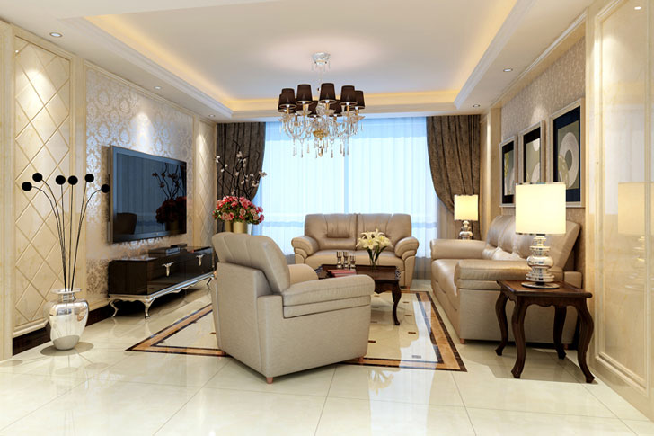原本客厅的采光较好,使得空间通透、明亮,电视背景墙的凹凸造型以及壁纸纹理的运用增加空间的多样性与生机,简单的配饰使整个空间效果大气且静谧。地面铺装采用暖色调且明亮的地砖加上局部拼花使得空间区域划分更加明了,更有层次感。