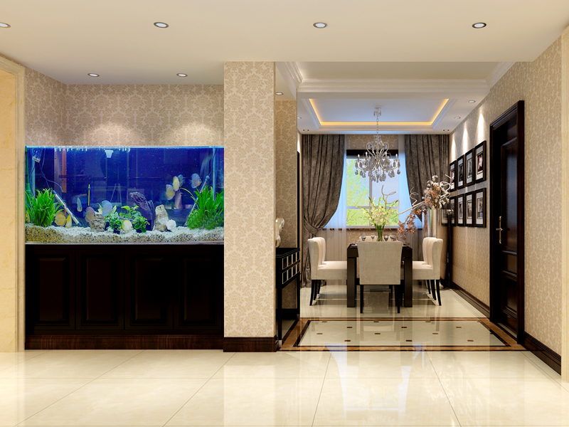 厨房空间较小,所以采用半开放式厨房与餐厅很好的结合在一起,淡雅的壁纸中透出一种简美的静谧优雅的感觉。为了满足业主的需求特留出了鱼缸的空间,为客厅增加生机,从客厅到餐厅、厨房相互融合贯通,显得安静、雅致,延伸着室内的空间。
