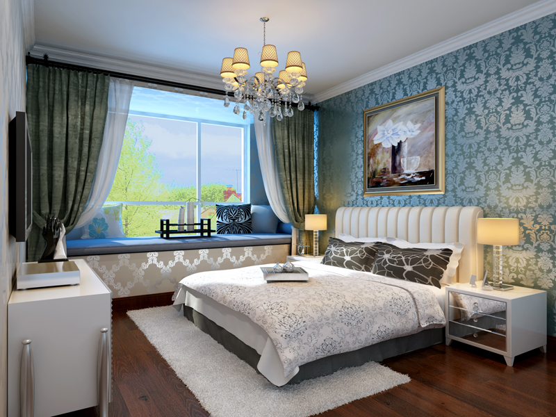 卧室整个空间的色调比较柔和,素雅贯穿这个整个室内的氛围,使得整个室内的色彩感觉舒适,简单的挂画以及美式灯饰透出一种安逸与雅致,飘窗的设计为平淡的生活增加情调与美感。