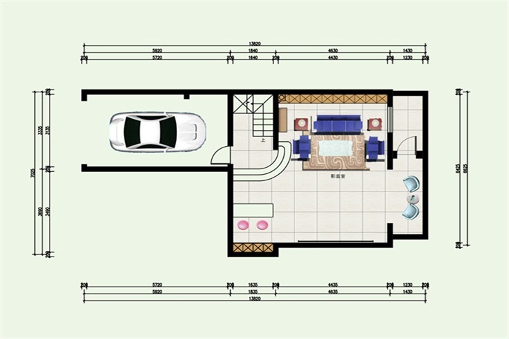 地下室布局:地下室原结构分为开敞式空间,根据客户要求,结合原有的空间,设计上分为吧台区和影音室。运用吊顶把整个空间划分开。