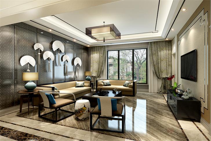 墙面色调含蓄统一,但不单板。浅褐色的微晶石地面,以不同颜色,不同花色的石材加以拼贴,节奏感强,而且整体明亮通透。家具选择了暖黄色的沙发、深色的柜子,再搭配蓝色的靠背,层次丰富。沙发背景墙的扇子装饰是客厅的点睛之笔,生动活泼,很大的提升了客厅的中式韵味,也很好的体现了设计师软装搭配的功底。半透明材质的吊灯,显得十分轻盈,在造型细节上,很好的与扇子装饰品进行了呼应。孔雀图案的小凳子,小巧精美,为空间增添了一丝趣味。