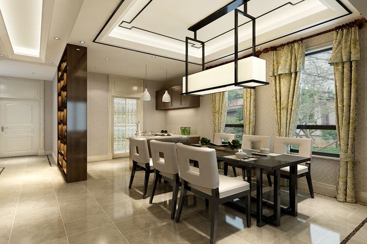 餐厅与客厅色调统一,无形中增大了空间的面积。餐厅的精彩之处在于餐桌椅、餐厅灯的选择,色彩对比强烈,造型考究,简约大气,既有传统中式风格的稳重低调,又有现代风格的简约时尚,可以很好的体现客户的良好品味。半透明灯罩的餐厅灯,色彩柔和,造型大气,很有日式风格的味道。开放式的酒柜,不但可以放置大量的摆件、酒具,也在无形之中把餐厅和过道做了很好的划分。