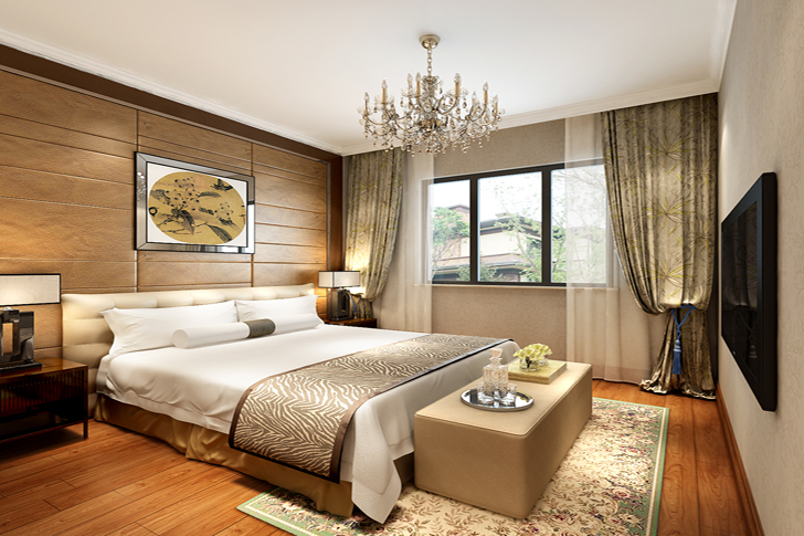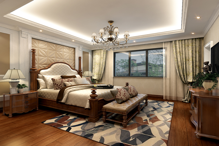 整体以棕色为主,较客厅而言,相对厚重一点,给人静谧安逸的感觉,让客户在忙碌一天之后可以有一个很好的睡眠空间。抽象图案的地毯是亮点,使整个空间在沉稳之余,多了一份活跃的气氛,不至于过于沉闷。
