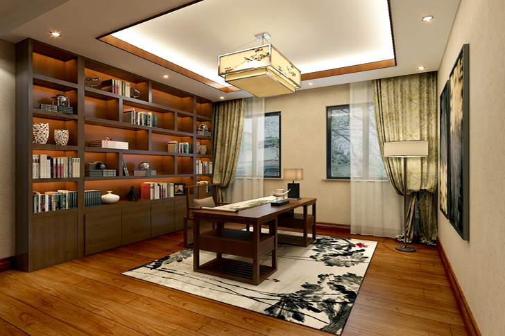客户作为高素质文化人,对书房的要求相对较高。中式的书房,会让人感受到浓浓的文化气息。家具造型简约时尚,稳重大气。设计师选择了印花的吊灯和水墨画的地毯,很好的突出了整体空间的风格定位,更增强了整个空间浓浓的传统文化氛围,这无疑是书房最出彩的地方