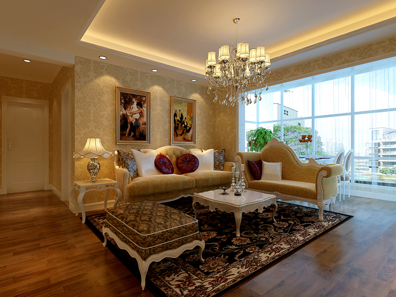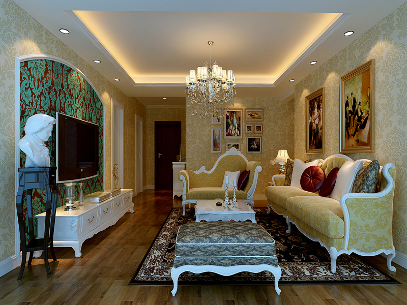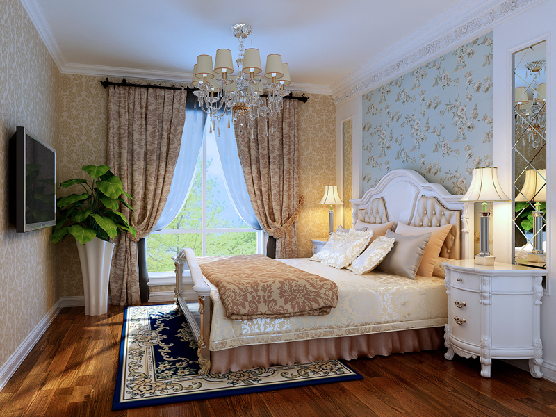 客厅整体用了比较柔和的团花壁纸满铺整,整体感觉浪漫,简洁,明快,柔和,落地窗帘也很有感觉,增加了室内的采光过道结构的调整,使得过道有了视觉的延伸感,扩大的过道的视觉空间感。