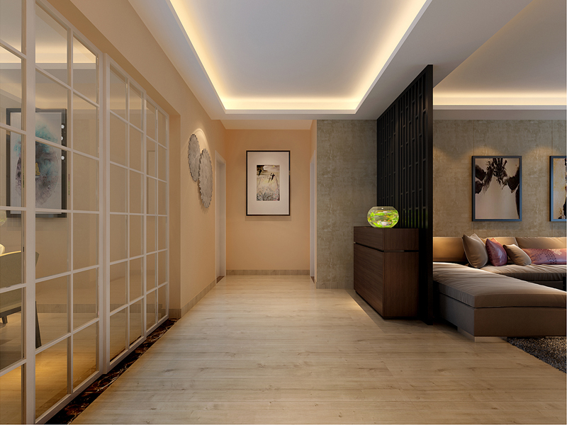 过道利用吊顶划分区域,整个空间采用地板铺贴的方式,效果比较统一,整体视觉比较有延伸感。