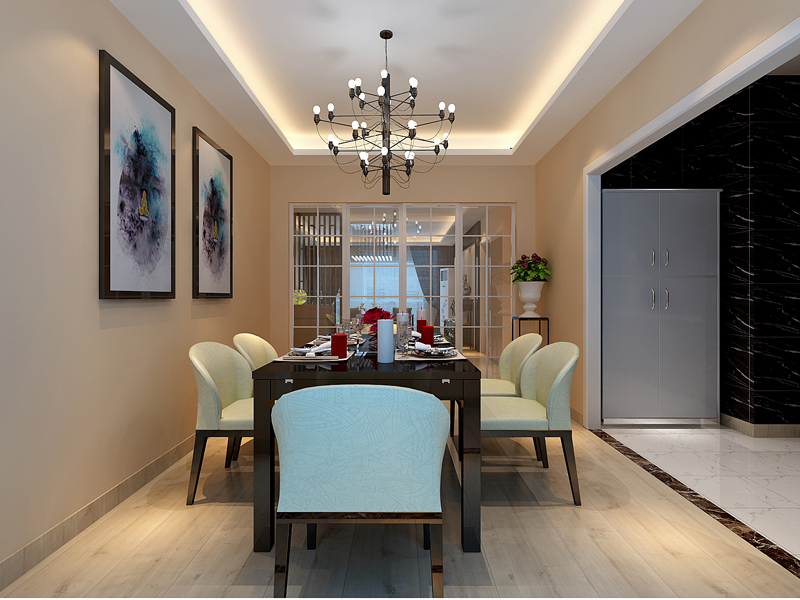 由于厨房和餐区的空间比较拘谨,所以厨房做成了开放式厨房,从而很好的与餐厅融合在一起。餐厅背景墙上加上简单的国画,使得整体空间带有禅意韵味,同时时尚的吊灯也为整个空间增加趣味。