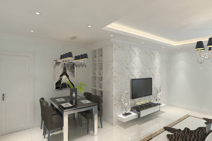 【餐厅】 餐厅和客厅在材质和家具造型上比较一致,吊灯和客厅的吊灯呼应。嵌入式的酒柜,在视觉上,和整个空间融入一体,整齐时尚。黑白装饰画也为餐厅增色不少,绿植使餐厅多了一份春意,令人感觉十分舒适。