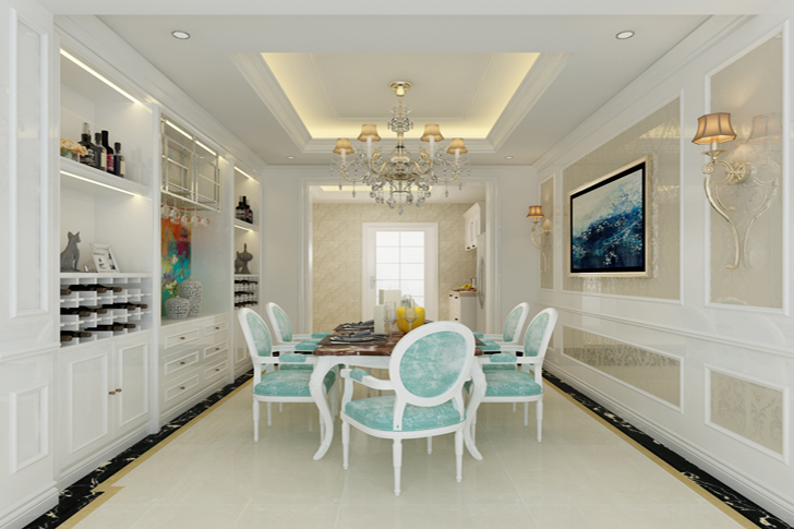 【餐厅】 色调以白色和暖黄色为主,蓝色为辅,使得空间在温暖之余,又有一丝凉爽。吊灯和壁灯造型优美,华丽而不夸张。蓝色的装饰画与餐椅呼应,点缀的恰到好处。整个餐厅最抢眼的,莫过于浅海水蓝的餐椅,造型考究,自然唯美,就像一股清凉的海水,在整个空间里涌动。