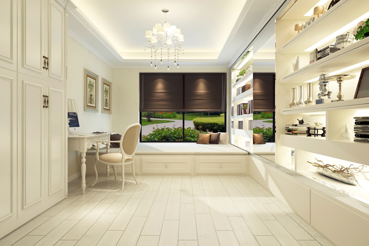 【书房】由于业主比较喜欢看书,家里的衣服也比较多,而居住的空间反而不需要那么多,所以在设计的时候把其中一间卧室改为一间榻榻米,衣柜和书房为一体的房间,看书累了可以在上面休息一下,很是惬意。实用与美观相结合,是本空间最大的亮点。