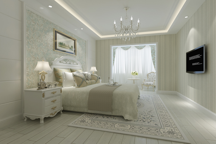 【主卧】 色调以白色为主,配以浅绿色壁纸,整体自然、淡雅。地面上的地毯和背景墙相呼应,营造出一个安静、淡然的的休息空间。亮点在背景墙的装饰画上,一幅充满自然气息的风景画,会使人心情舒畅、美好。