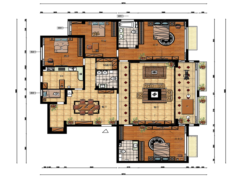 该户型的优点是有较好的采光,可以充分借景,面积较大,容易营造出大气的感觉,适合放精致优雅的古典家具。主人也可在空间内自如安排。