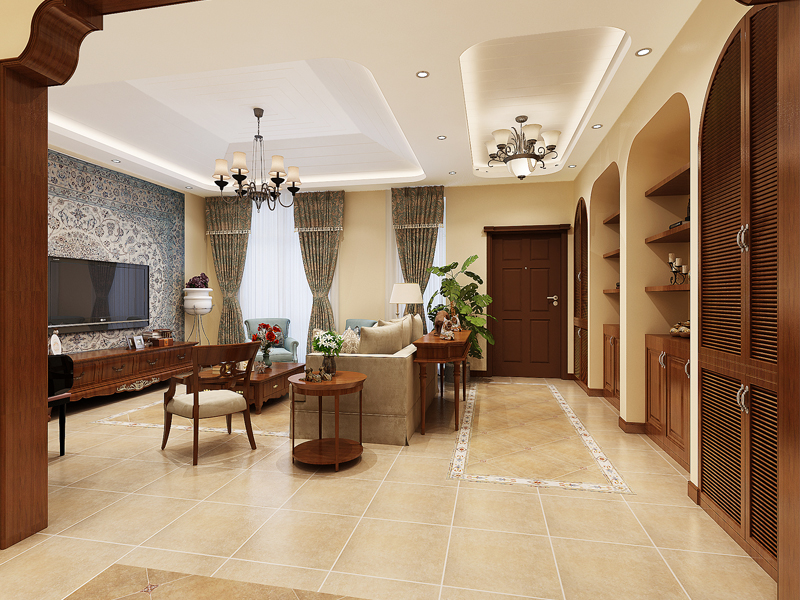 一进门,首先让人眼前一亮的便是进门处的壁柜,为了满足业主喜欢收藏的爱好,进门处的壁柜即迎合了业主的这一爱好,同时也充当了储物的功能,展示柜两边的储物柜左右对称,既美观又达到了储物与展示双重利用的效果,客厅与门厅的吊顶与地面遥相呼应,