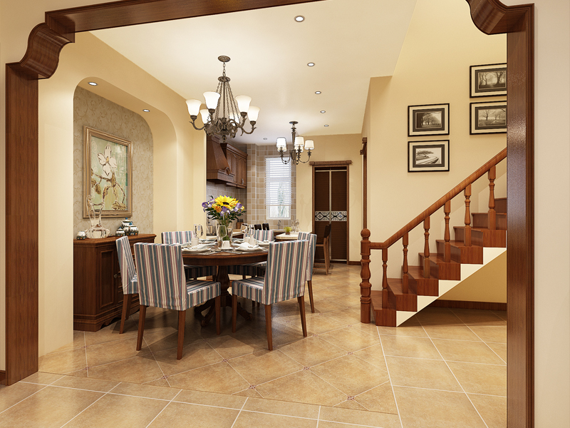 在保证主人休闲娱乐的同时也要满足其就餐环境的质量,餐厅作为用餐区,不需要太过奢华,但却需要制造不一样的就餐氛围,本方案中采用了开放式厨房,灶台旁边的小小早餐台,餐桌旁边的拱形造型,餐桌上下吊的美式吊灯,在不经意间造就了另一番情趣。