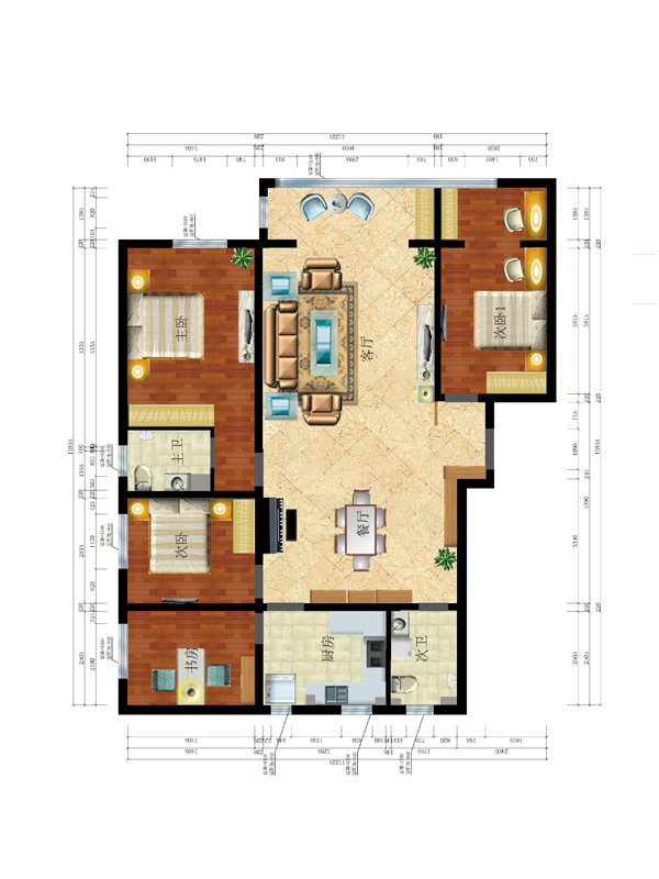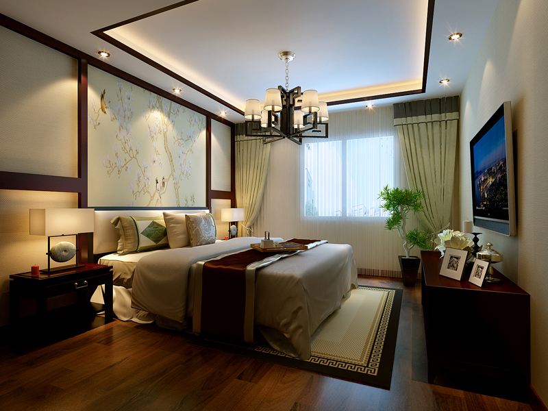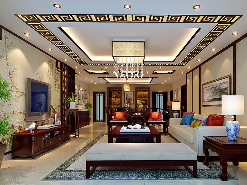 本户型为四室两厅户型,客厅餐厅卧室动静区划分明确,格局划分合理,采光非常好。客厅和餐厅虽然在一个空间,但是客餐厅之间的走道把二者划分开来,在整个入户的设计中门厅不够明确,后期我们通过一些修饰手法在入户门厅处做一个宽650的中式屏风,既可以让门厅区域明确,又使客厅的电视墙起到了延伸,使整个的客厅电视背景更加完整。电视墙面采用了如意格和壁画来修饰,沙发背景采用素色壁纸和木线来装饰,采用复杂和简洁对比的手法相互应,在加上顶面的灯带花格和角花的处理,起到了画龙点睛的作用。餐厅区域,和客厅在顶面上采用了通同样的灯带设计手法,加上木线和角花的相互结合,装饰柜的点缀,完全烘托出家的温馨氛围。主卧顶面灯池吊顶和木线来做装饰加上筒灯和吊灯的搭配和主卧床头中式花鸟壁画背景相协调,简洁大气,给人一个完全放松的休息空间。整个设计的亮点是在设计的处理手法上,书房的顶面采用中式木线和角花简洁大气,完全彰显出书香的气息。后期加上窗帘地毯和一些配饰的点缀,既突出了中式的元素韵味又符合了现代人居住生活的习惯特点,古典中式与现代结合,传统和时尚简约并存。