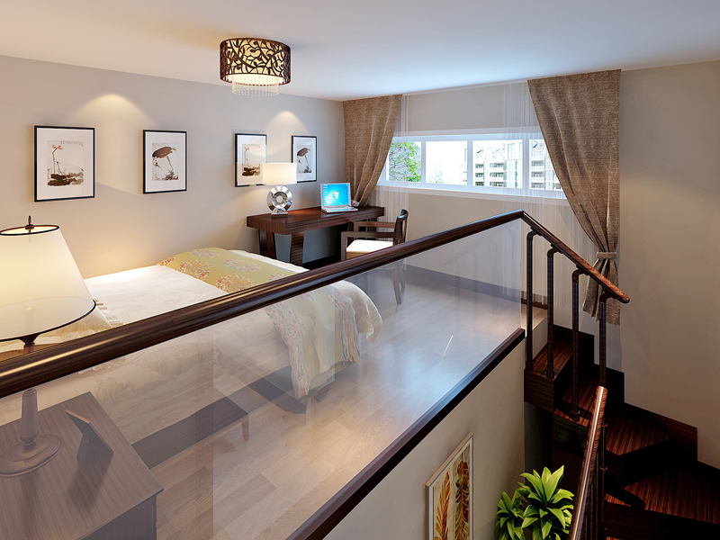 楼下为休闲和储物空间,为了把空间利用到最大,在此部分空间做了阁楼处理,木质楼梯和简洁时尚的钢化玻璃扶手,阁楼上为临时休息空间,阁楼下面业主喜欢的储酒空间。整个的使用空间利用到了极致。