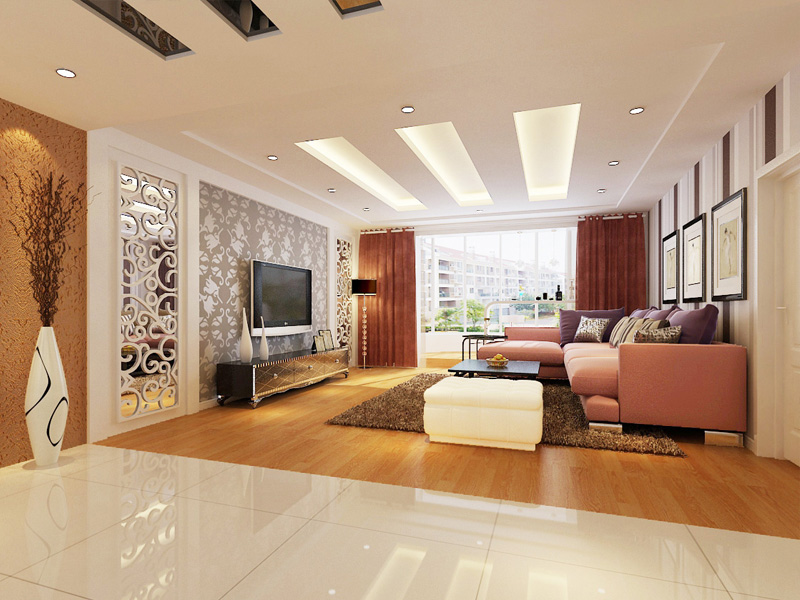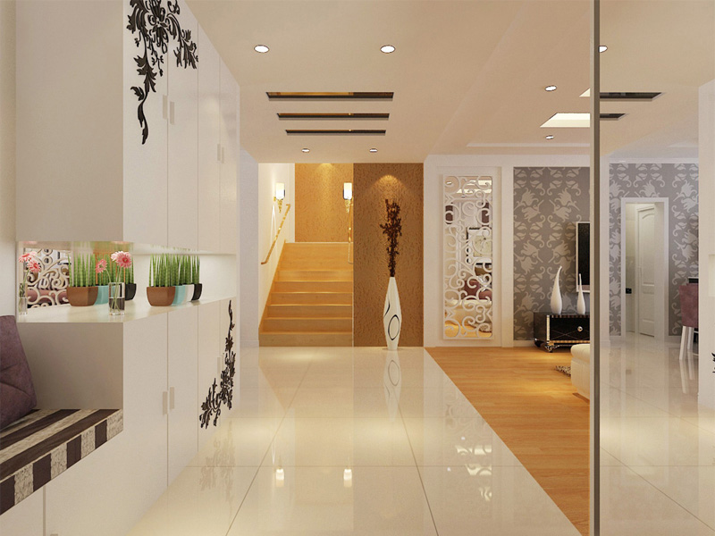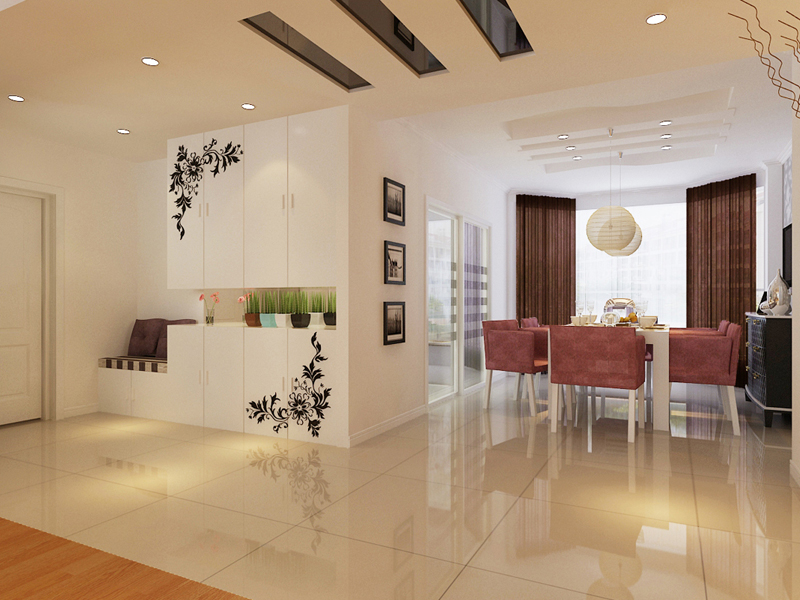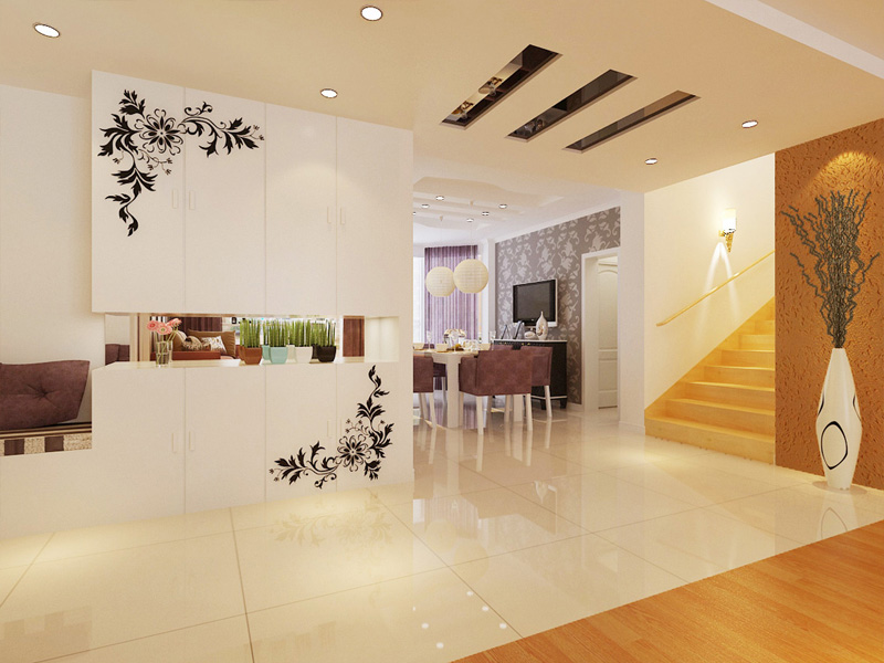 整个客厅以壁纸为主,壁纸的色调与地板相互呼应。客厅的吊顶与过道的吊顶在形状上保持了一致,矩形的吊顶不仅让室内空间在视觉上得到了一定的延伸感,也使得过道不再显得悠长与狭窄。客厅与过道之间的地面是地板与地砖之间的直接过渡,没有任何过多的装饰,在电视墙的左边,地板与地砖的过渡区域的墙面,采用与地板类似的颜色的壁纸,过渡自然且不烦索,整体的效果与本文简约、时尚的主题相互应。放眼望去,其家具与室内整体环境非常协调,总的特征是造型简单但不失优雅,客厅的背景墙两边选择用镜子,并把雕花粘在镜子上使得整个空间不仅设计独特而且空间感更强。