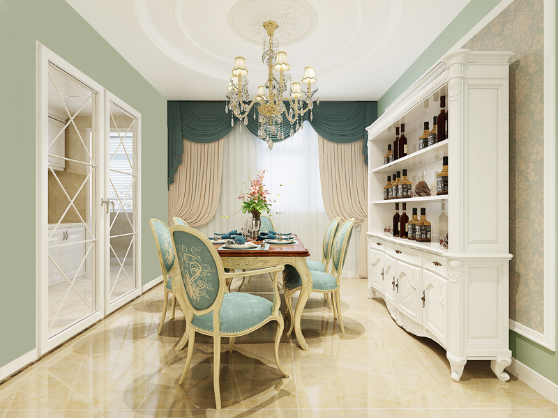 餐厅是室内设计的心脏,和客厅一样,浅色仍然是主色系,弧形的吊顶、欧式的水晶灯、简约的欧式餐桌椅,在不经意间造就了一种和谐的就餐环境。