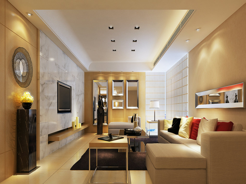在地板的取色上用暖色,,家具的取色上也采用相近的暖木色,使客户有温馨的感觉,在其墙面的装饰上用几何形的金属框架来装饰镜面,有扩大空间的效果,开阔了视野,也将空间变得明亮,电视背景墙则用石材来与地面相呼应,大理石的电视背景墙有强烈的现代感,电视柜与电视背景墙的简约搭配使整个空间增强了现代感,吊顶则是统一的原顶,卧室的床头背景墙用暖色的软包来体现,在软包中做半镂空,与电视背景墙相协调。