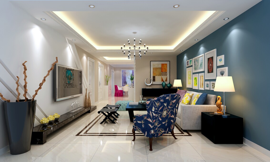 客厅时尚大气中不失单调。整个空间开阔,布艺的沙发,软软的碎花抱枕,风格不一的柔美挂画的点缀,不同的点缀,虽多但并没有让整个空间凌乱,反而让整个空间的格局充实。