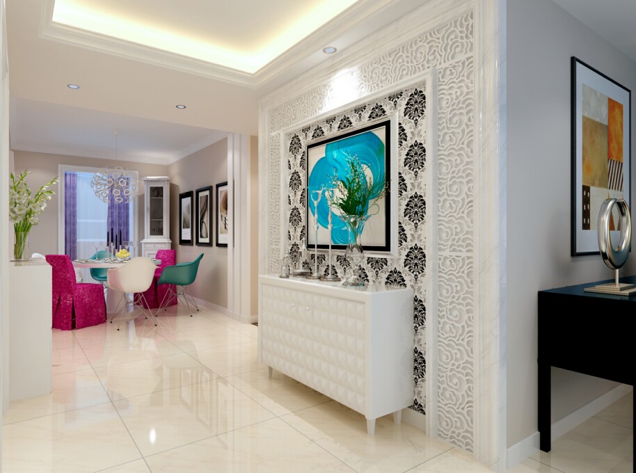 门厅的设计以简约时尚为主线,门厅是主人进入家里最先步入的空间,也是业主最为关注的空间,镂空雕花的套线框构成一个玄关背景,复杂造型中又有简约,玄关柜上挂画的点缀,让空间多了一份艺术的气息,活泼而具有生机的绿植与挂画的相互呼应,时尚又大气.在外工作一天的主人打开大门的瞬间顿时卸下疲劳,心旷神怡。