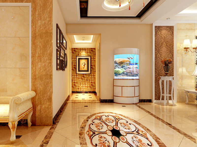 在户型结构方面,南北通透,采光良好,各空间面积大小较为合理,但人口比较简单建议业主做了户型结构调整。原有结构是4居4卫的格局,对于3口之家来说独立空间的数量有些多,根据业主对书房的特殊要求,就是要够大,通透。所以将北侧的双卧合并改成一个大空间,同时做了兼具客房的榻榻米。进门正对的金色马赛克特别吸光,目的就是让它来引光,让过道亮起来。客厅中有着古典美的沙发,虽古典,但不古板,坐上去很舒适,享受着一种异国的情调在卫生间的改造上把原有厨房对面的公卫取消,满足主人储物的需求。整套居室的色系为米黄色的暖色,让家更加温馨,造型简约精致,又不失欧式风格的大气靓丽。