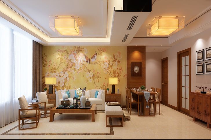 客厅是传统与现代居室风格的的碰撞,设计师配合现代的装饰手法和中式清油木色元素,简洁的吊顶,配上带有中式元素的家具和简约的吊顶来呈现亦古亦今的空间氛围。同时客厅的背景墙采用生态木和壁画做修饰,与阳台的吊顶和餐厅的背景墙相呼应,将空间的美感体现的淋漓尽致。