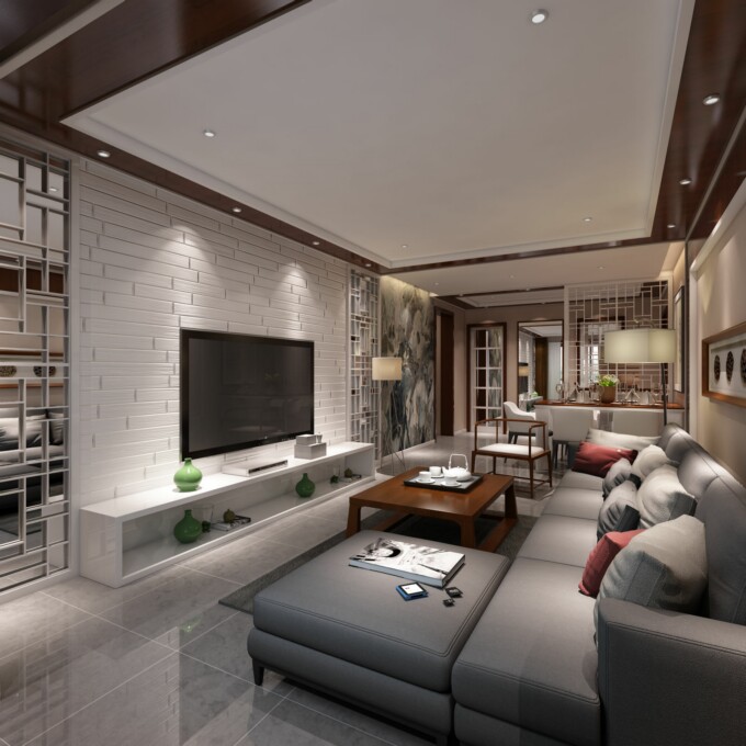 客厅处吊顶造型呼应门厅形成首位呼应,电视背景墙采用白混油花个底衬清镜,传统中式原色配以现代镜子实现新中式的视觉冲击。中部采用复古砖上墙,配以吊顶上的洗墙小射灯,灯光照射在极具层次的文化复古装上。形成光与影的完美融合。 沙发背景墙呼应电视墙与吊顶做了对称式木作造型的设计配以L行布艺沙发。整个客厅既有了中式的情怀和氛围,又不失现代的舒适和时尚。