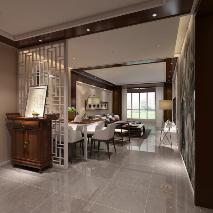 门厅出采用跌级吊顶胡桃木饰面的吊顶造型,将门厅从整个空间中划分出来,木饰面颜色和整体定制花格确定风格定位。 玄关花格为了不失现代感采用混油白颜色搭配实木复古的中式鞋柜在配以吊顶上局部光射灯。复古中式与现代光影的结合,让人一进门就能感觉到强烈的视觉冲击力和设计感。