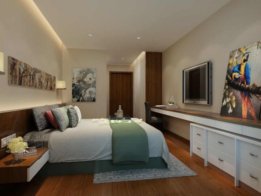主卧室墙体采用暖黄色打底,使得卧室在视觉上更具舒适感,整体吊顶仍然采用欧美极流行的平顶开墙面隐光,满足了衣柜的照明和床头的装饰照明,空间层次感更强。灯光上采用无主光设计,空间照顾更加柔和。定制床头更具时尚感,木饰面颜色呼应客厅的中式木饰面颜色形成整体统一。床头灯带呼应吊顶灯带对床头挂画形成侧照明让挂画层次感更强。定制一字型写字台满足了基本办公功能外也满足了电视柜的需求,此手法沿用酒店设计,让空间使用率更高。