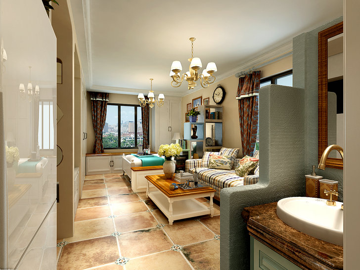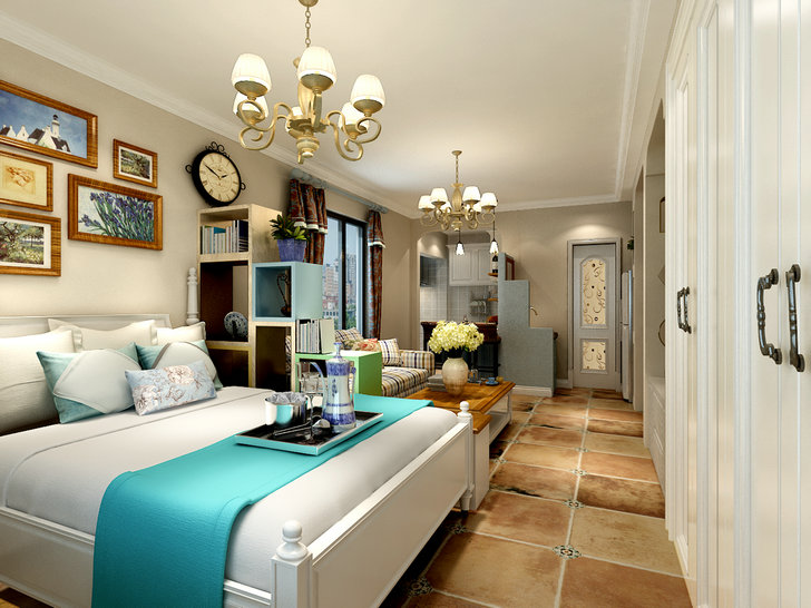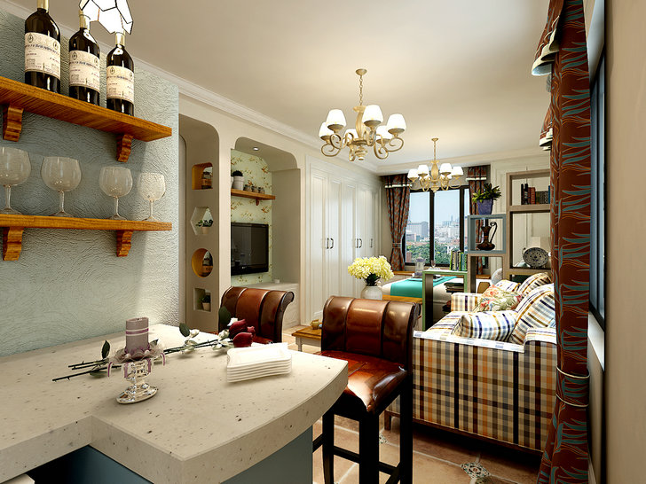 本户型是开间户型,房子的主人是幸福甜美的小两口,女主人对于户型的要求极高,既要满足日常的生活需求还要加大空间的储藏功能,而男主人对于空间的色彩方面也是有一定的要求,色彩不能过于冷也不能过于暖,想要一种与众不同的感觉。而我对这个户型的理解要远超于客户的需求,因为是小户型,既要考虑储藏性的同时还要把握空间的整体效果,我希望设计出一个温馨而又浪漫、幸福而又甜美、就像清风那般淡雅而又不缺乏趣味的房子。所以我选定地中海风格作为定向,从实用和美观的整体性入手,让整个家灵动起来。