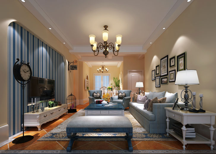 本设计根据空间及业主喜好,定位为地中海风格,采取传统地中海风格的色调,特色仿古地砖的斜铺,佩戴白色地中海角花。客厅中间使用地中海风格特色的弧形