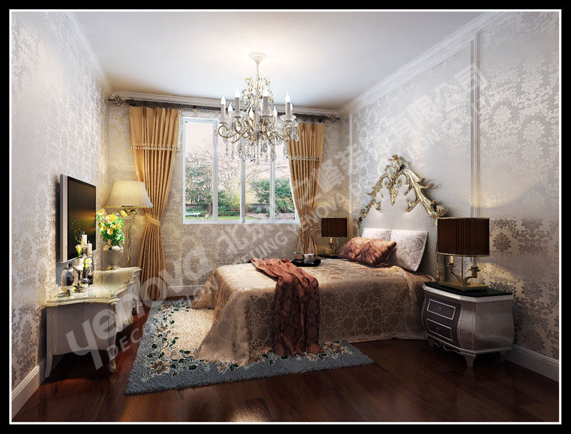 整体色调以红黄为主,体现出主人的高贵气质,在壁纸的选择上,主要以浅黄色为主,增加居室的温馨度。
