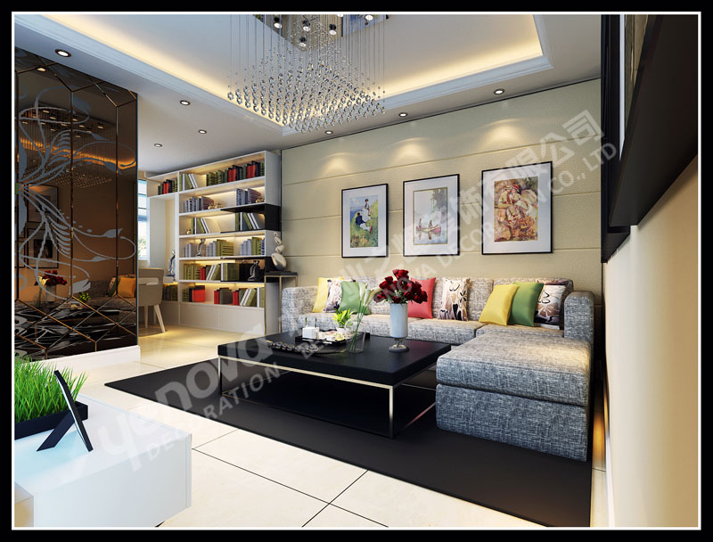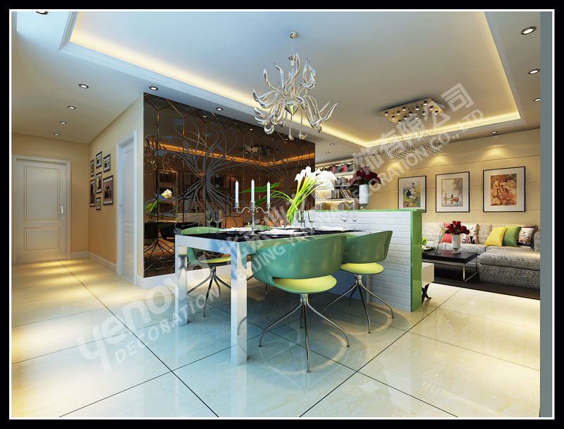 本案风格定位为现代风格,本案主人思想前卫,消费理性,对家的设想很细致,此套户型客厅朝北,采光不是很好,且空间不是很宽敞,所以在一开始就想到了要在视觉上扩大房子的空间感,提高采光感,所以在客厅的南墙面整个墙面采用车边茶镜,增强空间的延展性,提高采光感,客厅与餐厅合为一体,反而显大气。客厅的电视背景墙。整个空间格调清新明亮,时尚大气。