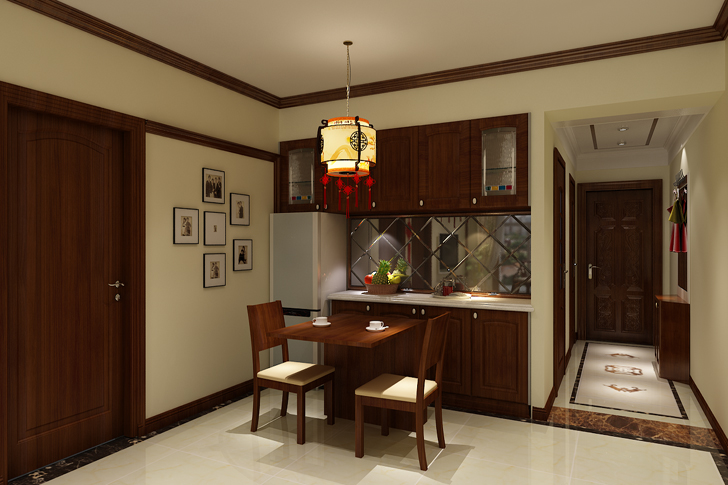本案定为新中式风格。居室中简单整洁的造型和线条,彰显出,稳重、大方而不失高贵的气质,餐厅柜子增加了储物空间,餐厅镜面背景墙的设计给整个空间起到了美观的画龙点睛之笔。案例多用木材、镜面、木地板等一些做旧的材质,为客户打造了一个清雅含蓄,端庄丰华的家。